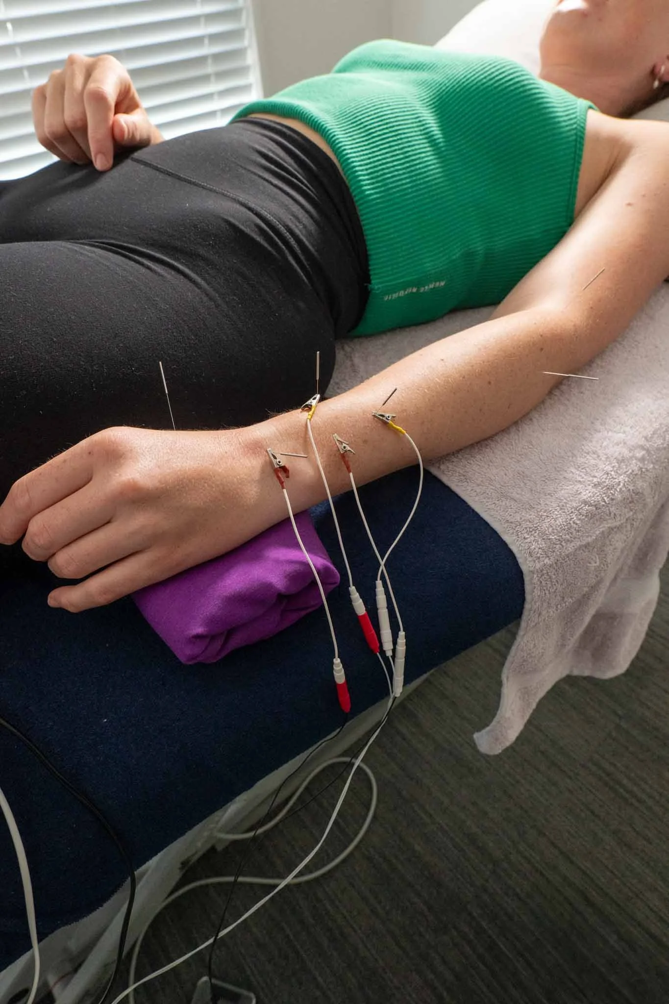 Electroacupuncture treatment applied to a patientβs wrist with gentle needle insertion and electrical stimulation.
